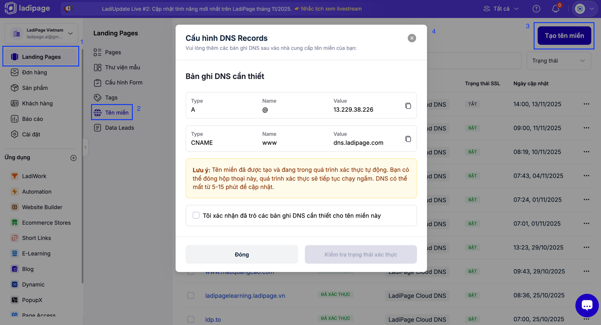 Hiểu được điều đó, LadiPage tiếp tục cải thiện trải nghiệm người dùng bằng bản cập nhật mới cho luồng thao tác Tên miền, giúp mọi bước trở nên tự động - nhanh chóng - chính xác hơn.