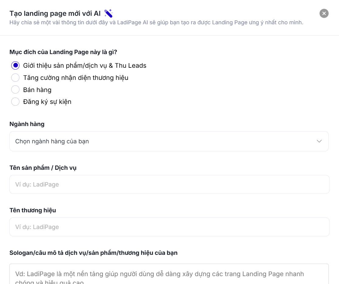 Tạo mới Landing Page: Nhập thông tin theo nhu cầu để AI tự tạo ra một trang hoàn chỉnh trong vài phút: mục đích tạo Landing page, ngành hàng, màu sắc thương hiệu,...