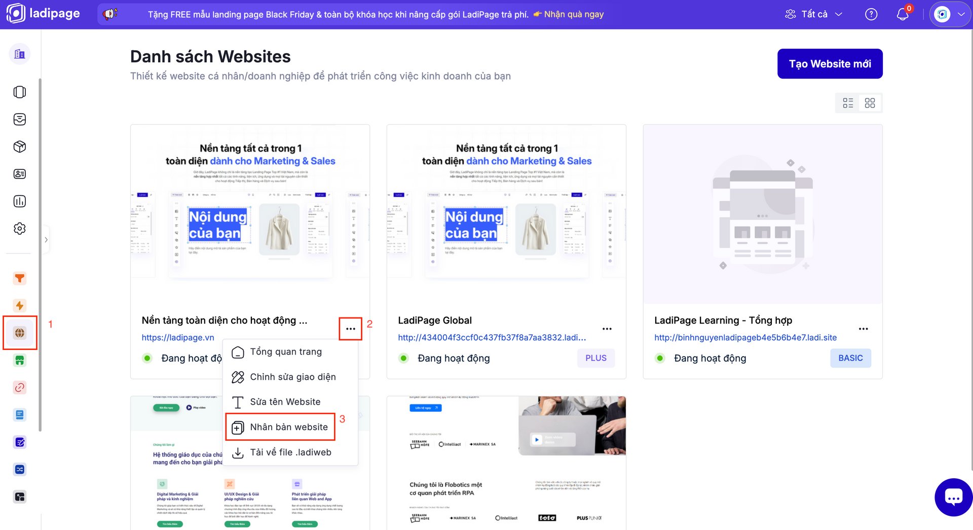 Song song với bản cập nhật file .ladiweb, Website Builder đồng thời ra mắt tính năng Nhân bản website giúp bạn tạo ra một bản sao đầy đủ của website hiện tại ngay trong hệ thống.