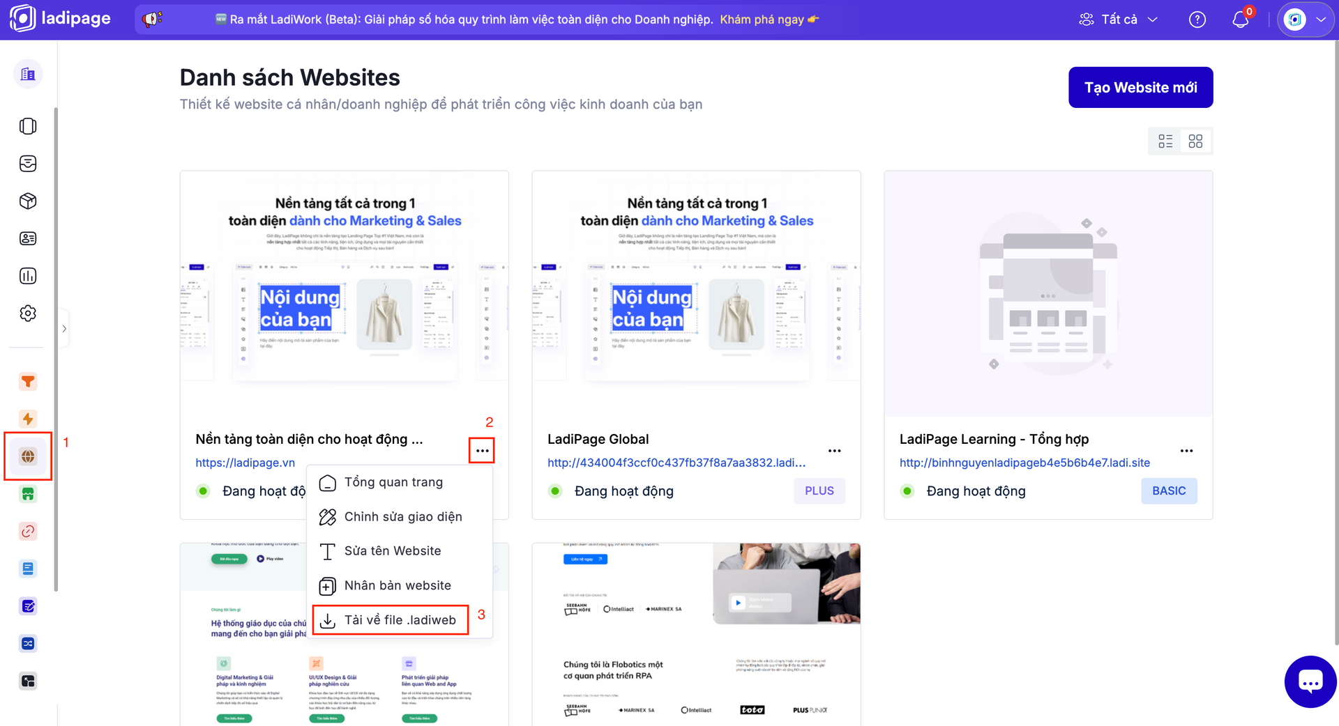 Website Builder đã bổ sung khả năng tải xuống file .ladiweb và sử dụng file này để tạo một website mới hoàn chỉnh. Tính năng này hiện được áp dụng cho gói LadiPage trả phí.