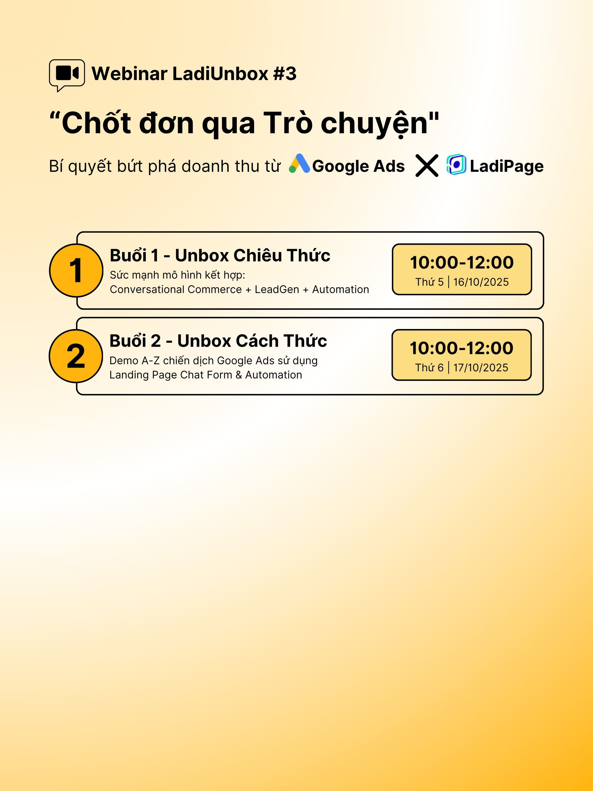 LadiUnbox là chuỗi webinar định kỳ từ LadiPage, nơi “mở hộp” những chiến lược và giải pháp thực chiến, giúp Cá nhân & Doanh nghiệp trong các lĩnh vực Đào tạo, Tuyển sinh, Tổ chức sự kiện, FnB, Bán lẻ tối ưu quy trình và tăng trưởng bền vững.